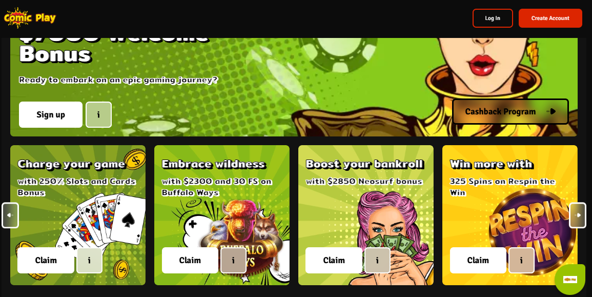 - How can I claim an offer at Comic Play? To claim it, simply sign up for an account at Comic Play Casino and the bonus will be automatically credited to your account.